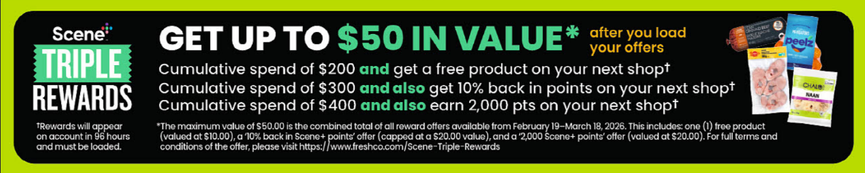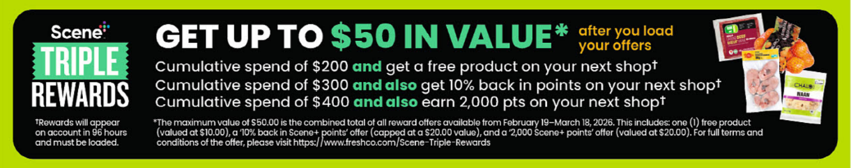 Load the Triple Rewards offer (the “Offer”) onto your Scene+ card and earn a reward offer based on your cumulative eligible grocery purchases made between February 19 and March 18, 2026 (the “Offer Period”). The Offer must be loaded to your registered Scene+ account prior to your first qualifying transaction.